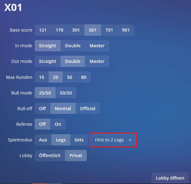 Folgende Einstellungen sind für das Spiel vorzunehmen, achtet dabei auf den angesagten Modus (first to) und stellt den ggf. um.