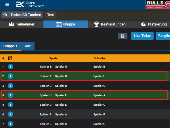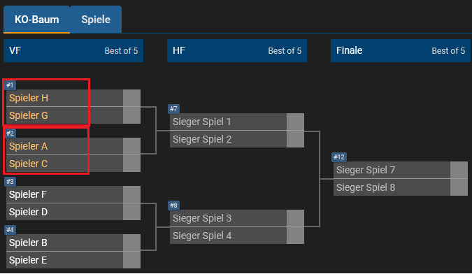 In der Gruppenphase oder im Schweizer System sind die frei gegebenen Begegnungen grün hinterlegt. Alle anderen Begegnungen dürfen noch nicht gespielt werden.